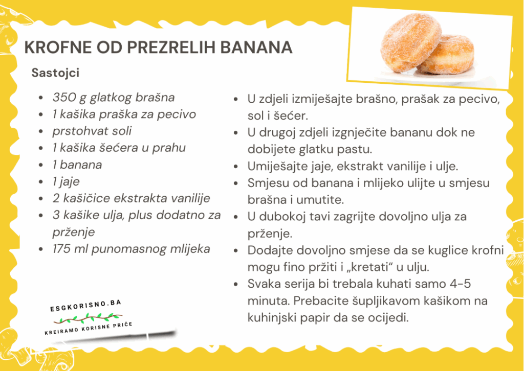 Sigurni smo da svi s vremena na vrijeme imaju jednu ili dvije banane koje stoje dugo u zdjeli na kuhinjskom stolu, već previše “istačkane” i neprivlačne za jelo. U nastavku ideja kako da ih iskoristite. Pametno kuhaj za zdraviju planetu!